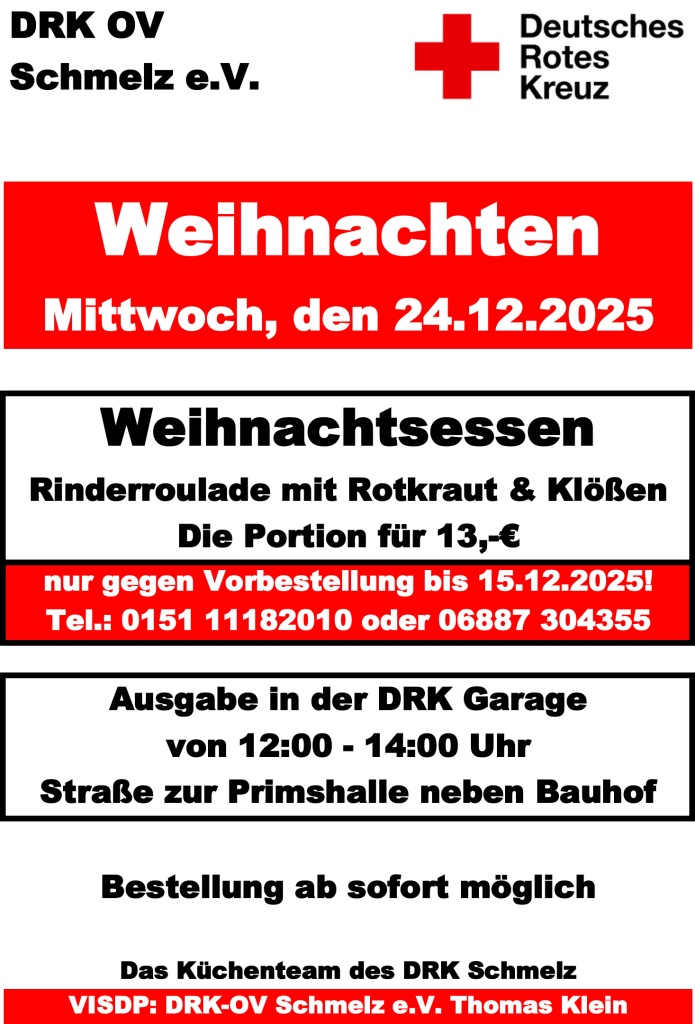 Wir bitte bezüglich der Planung um Vorbestellung bis Montag den 15.12.2025 unter der Tele.-Nr.: 0151-11182010, 06887 – 304355 oder per E-Mail: drk.schmelz@t-online.de